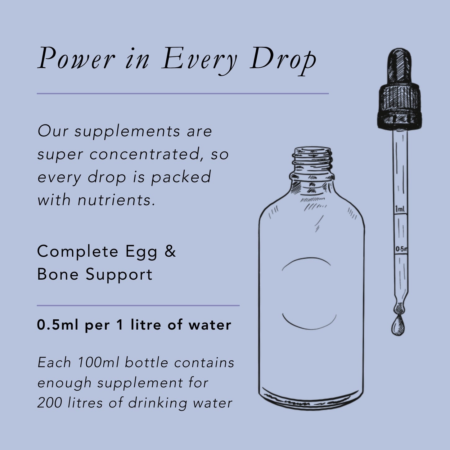Supplied in a 100ml amber glass bottle with a dropper top. Each dropper has 0.5ml and 1ml measurement markings, for simple dosing.