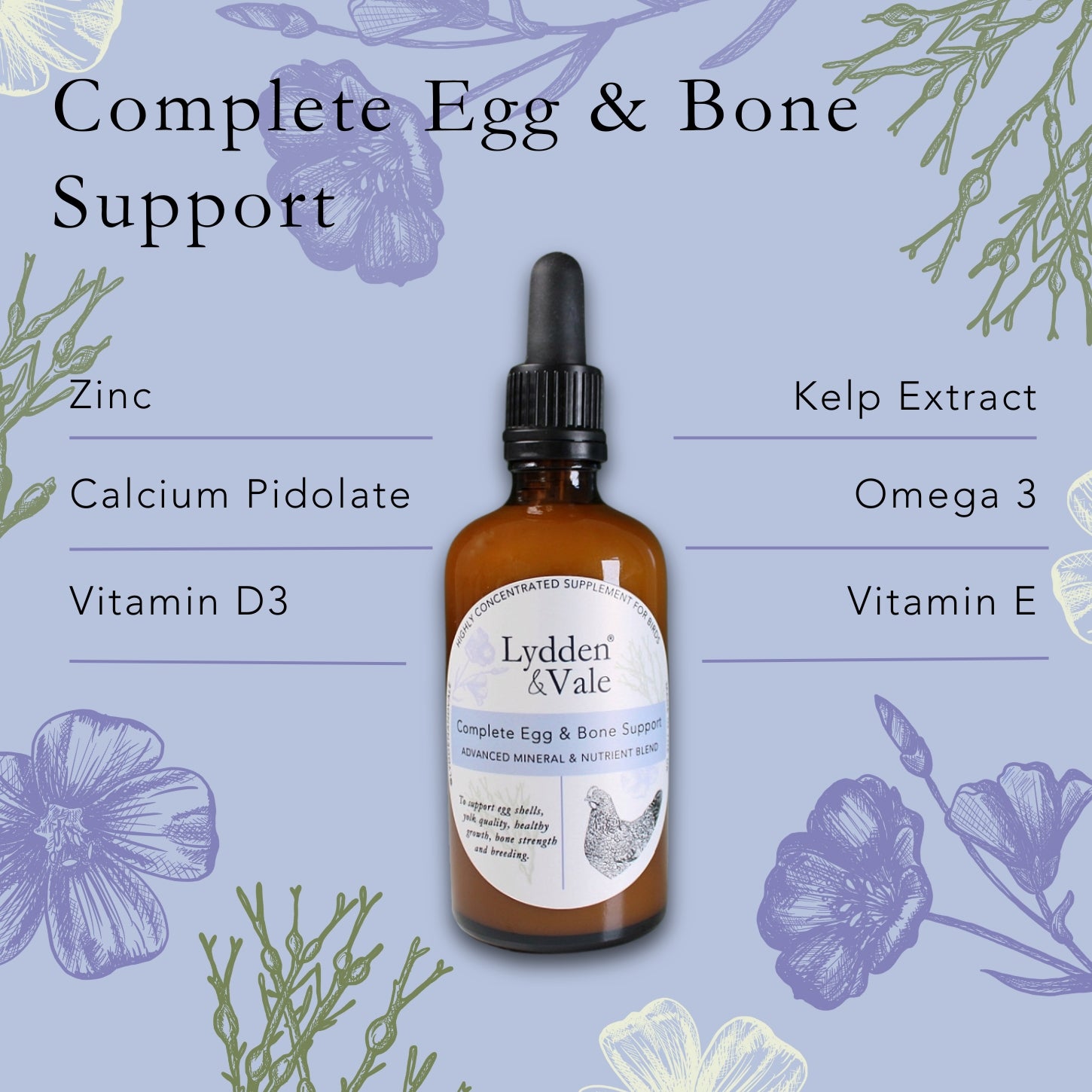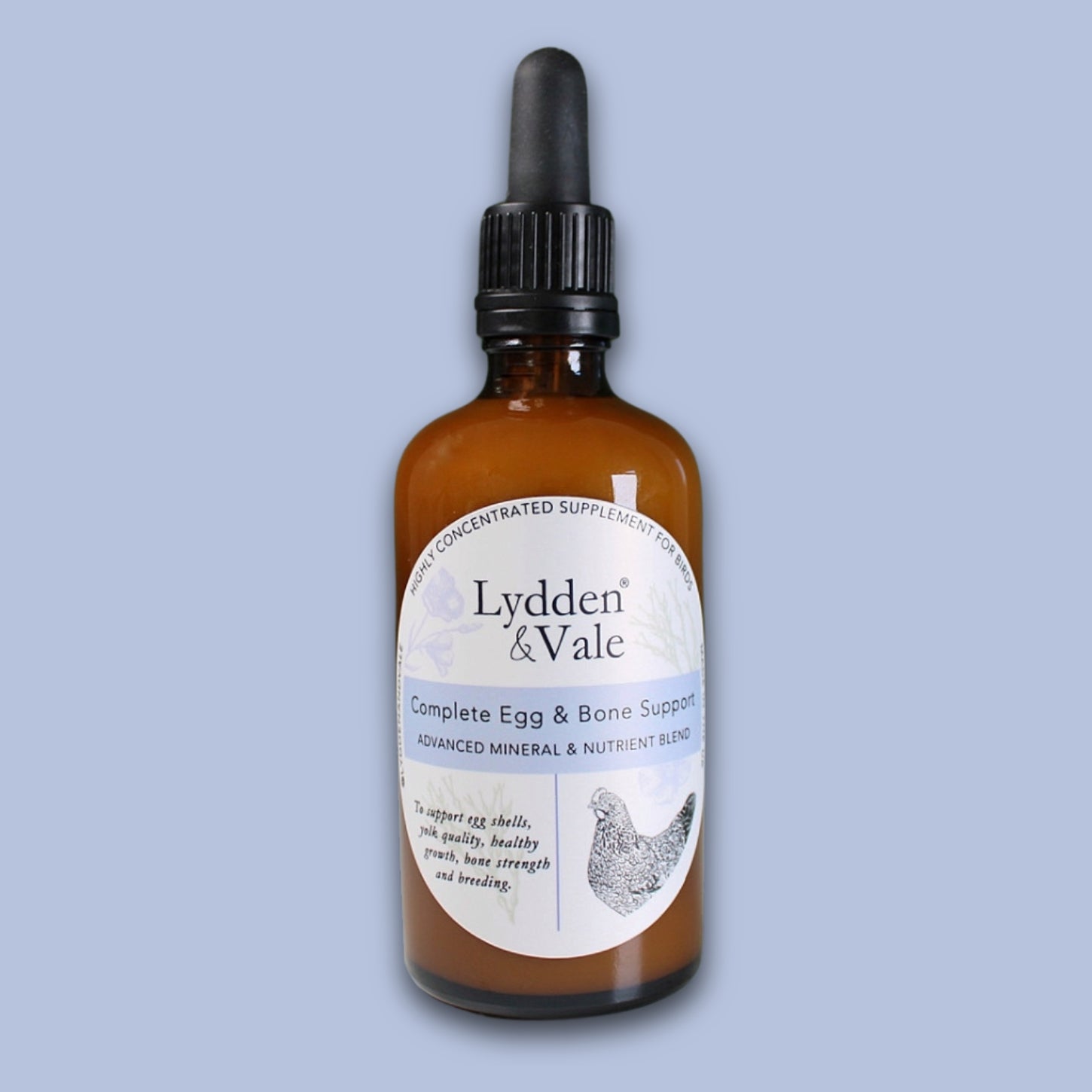 Lydden and Vale's Complete Egg & Bone Support is a concentrated supplement for supporting poultry and avian egg shells, yolk quality, bine strength, healthy growth and breeding.