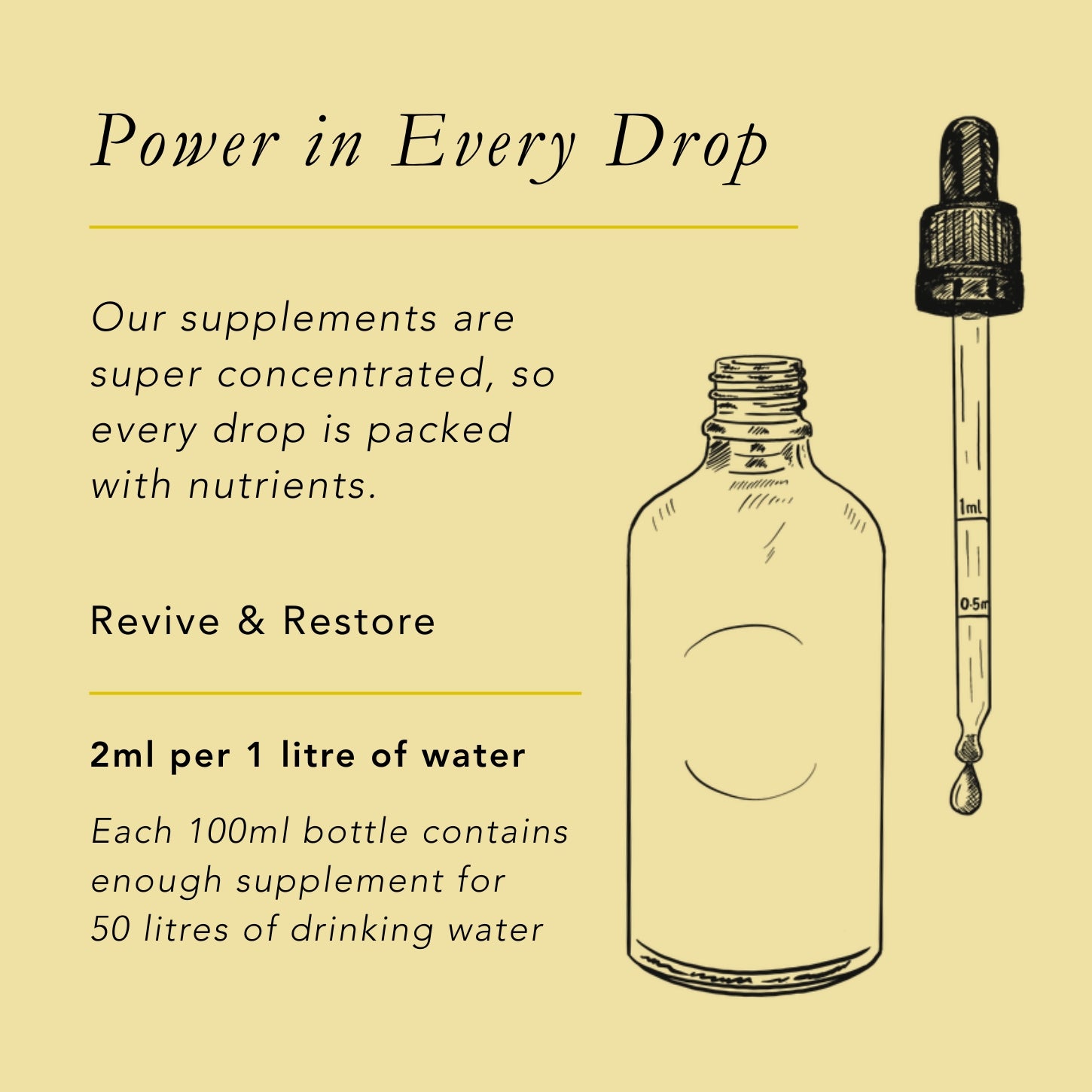 Supplied in a 100ml amber glass bottle with a dropper top. Each dropper has 0.5ml and 1ml measurement markings, for simple dosing.